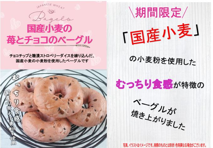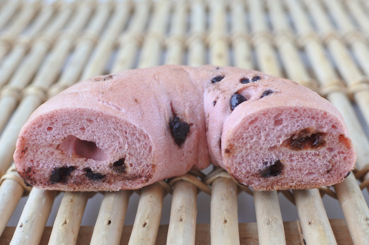 チョコチップと糖漬ストロベリーダイスを練り込んだ、国産小麦の小麦粉を使用したベーグルです。