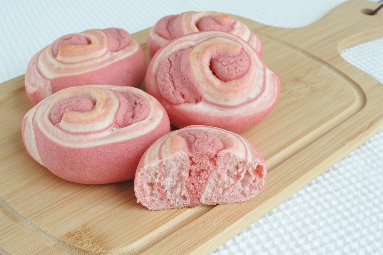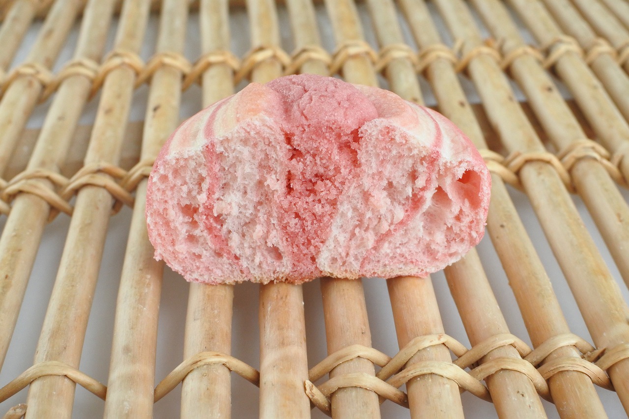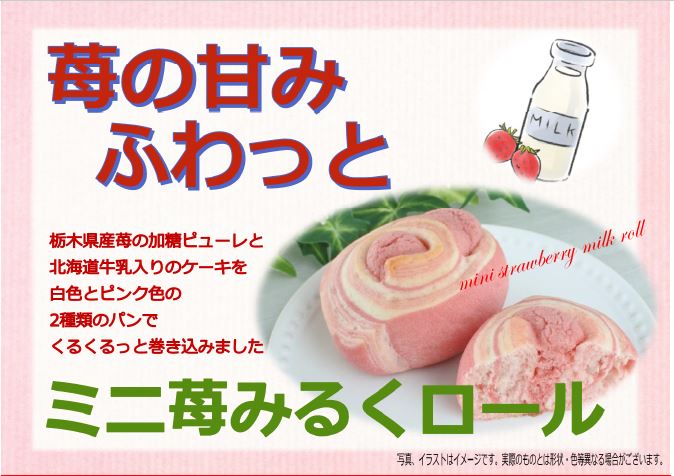栃木県産苺の加糖ピューレと北海道牛乳入りのケーキ生地を白生地とピンク生地の2種類の生地で巻き込んだ製品です。