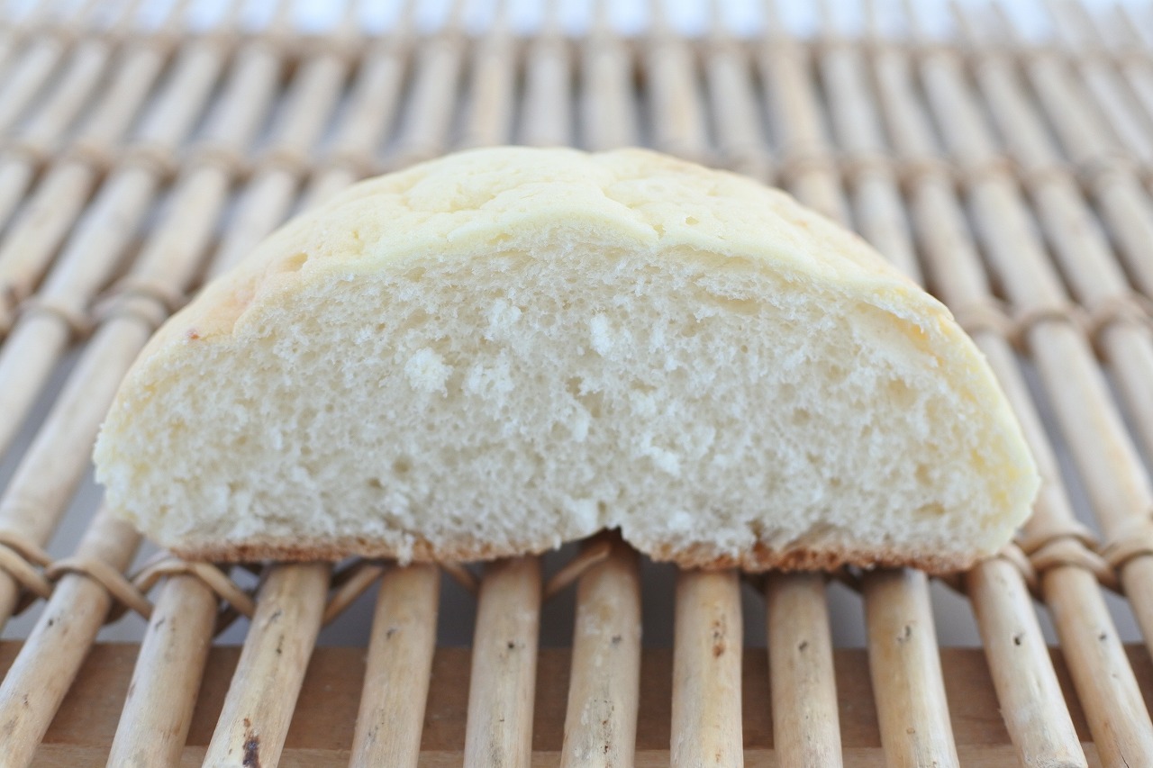 国産小麦の小麦粉を使用したメロンパンです。ビスケット生地に、北海道産メロンの加糖ピューレを練り込みました。