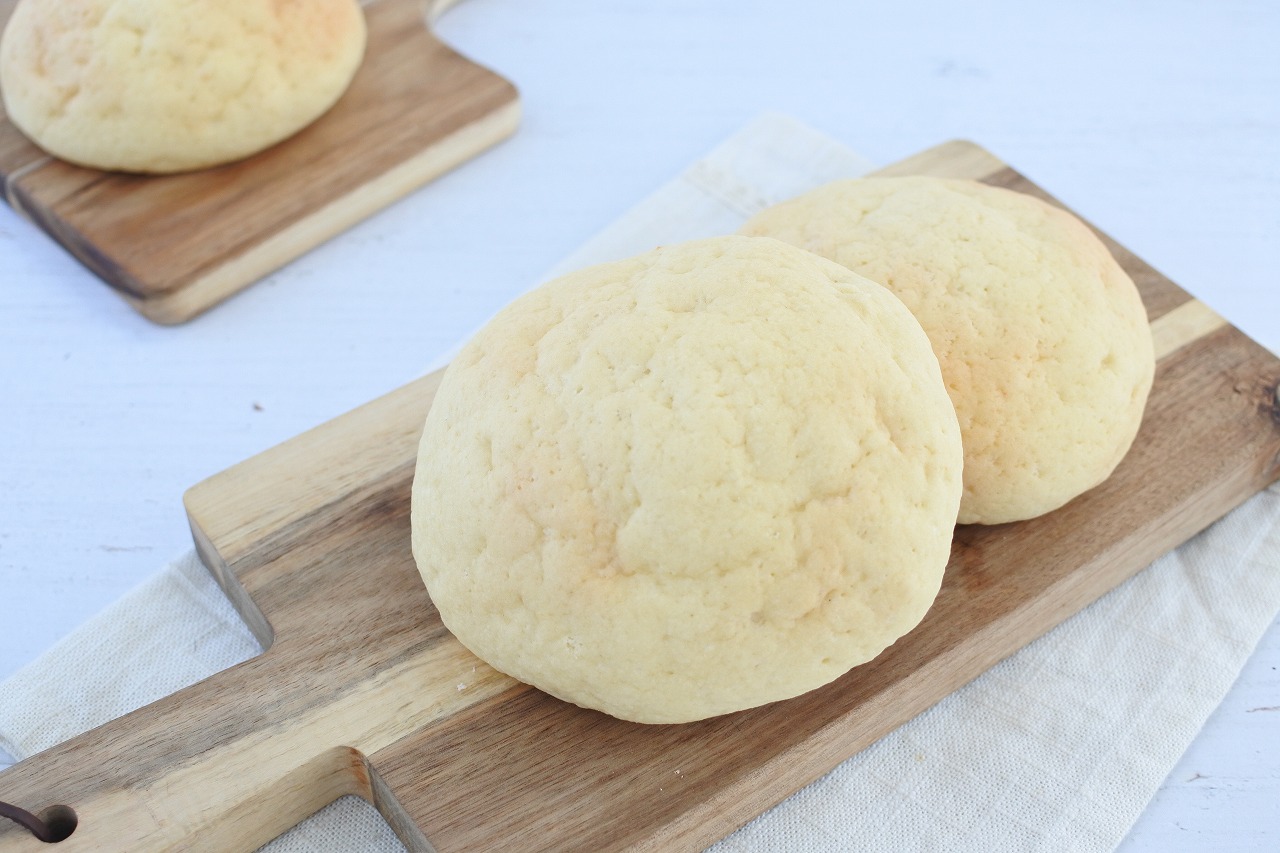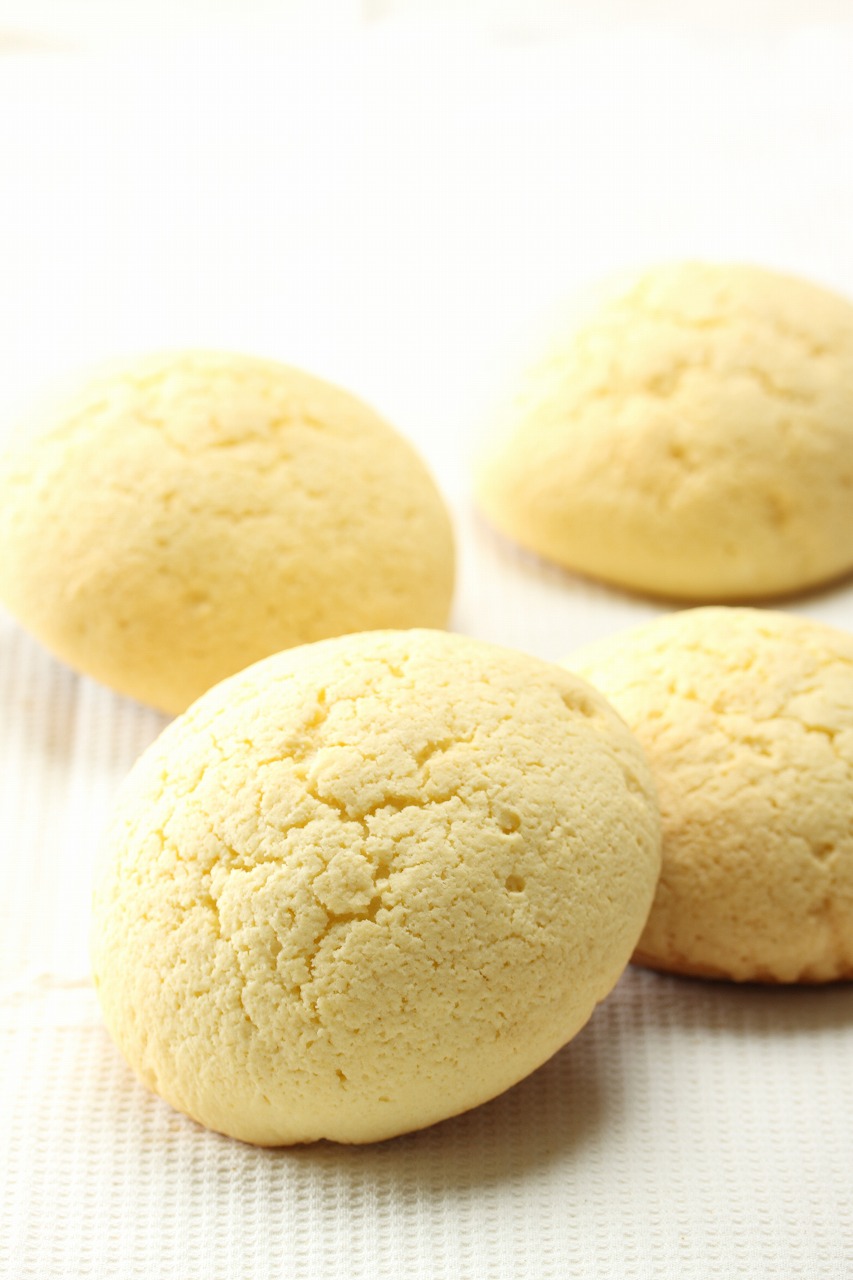 国産小麦の小麦粉を使用したメロンパンです。ビスケット生地に、北海道産メロンの加糖ピューレを練り込みました。