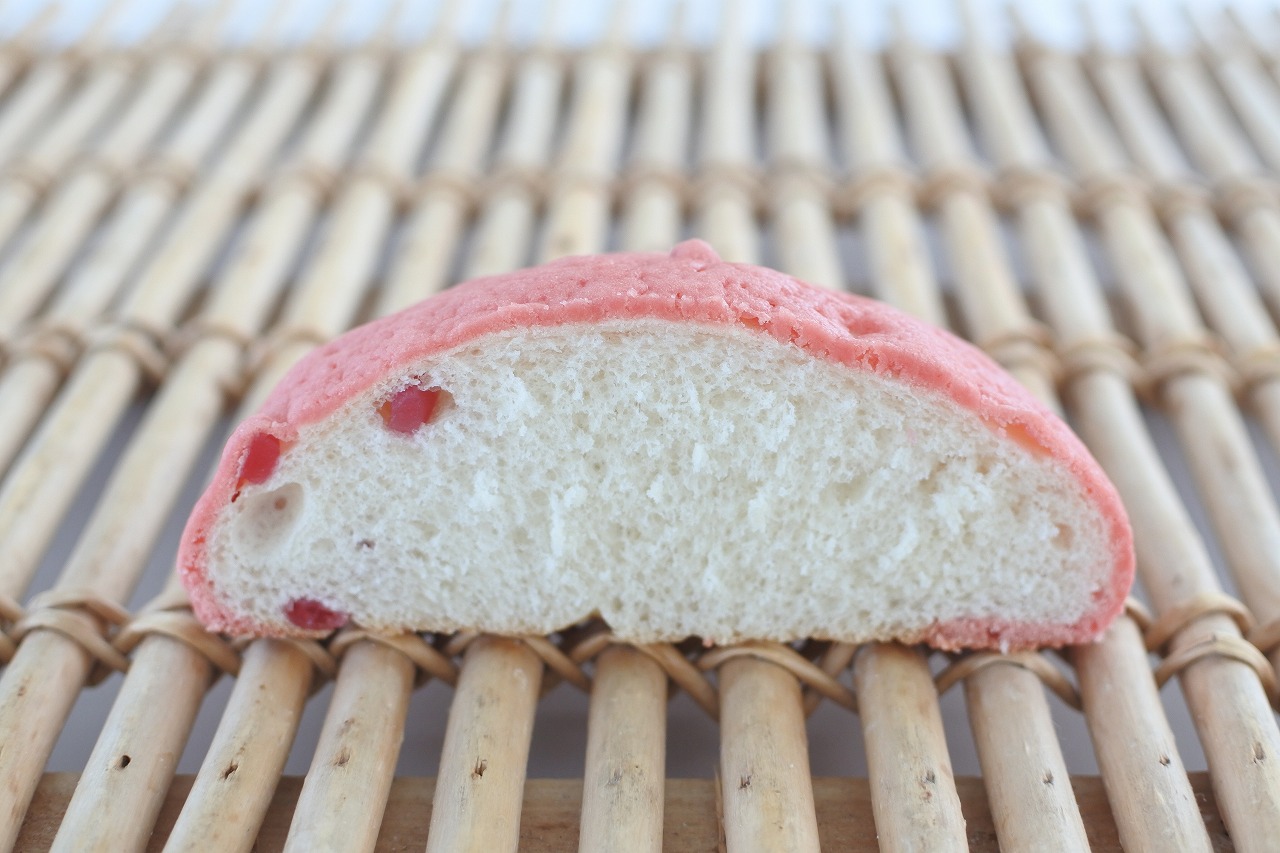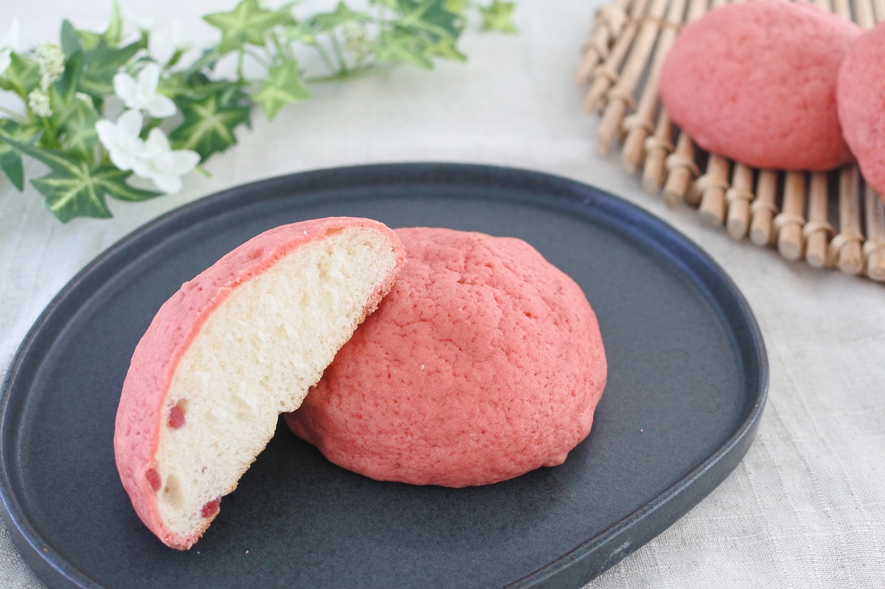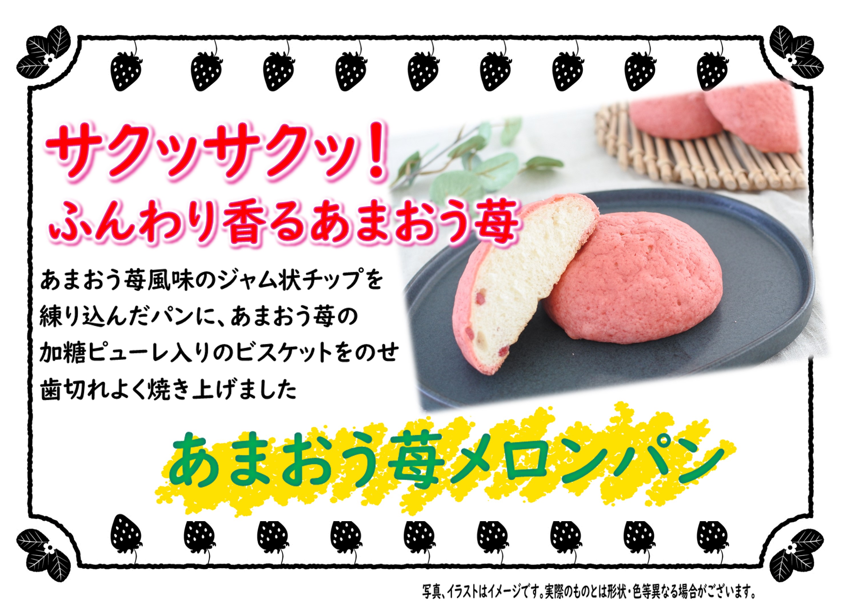 あまおう苺風味のジャム状チップを練り込んだ生地に、あまおう苺の加糖ピューレ入りの赤色ビスケット生地を被せたメロンパンです。