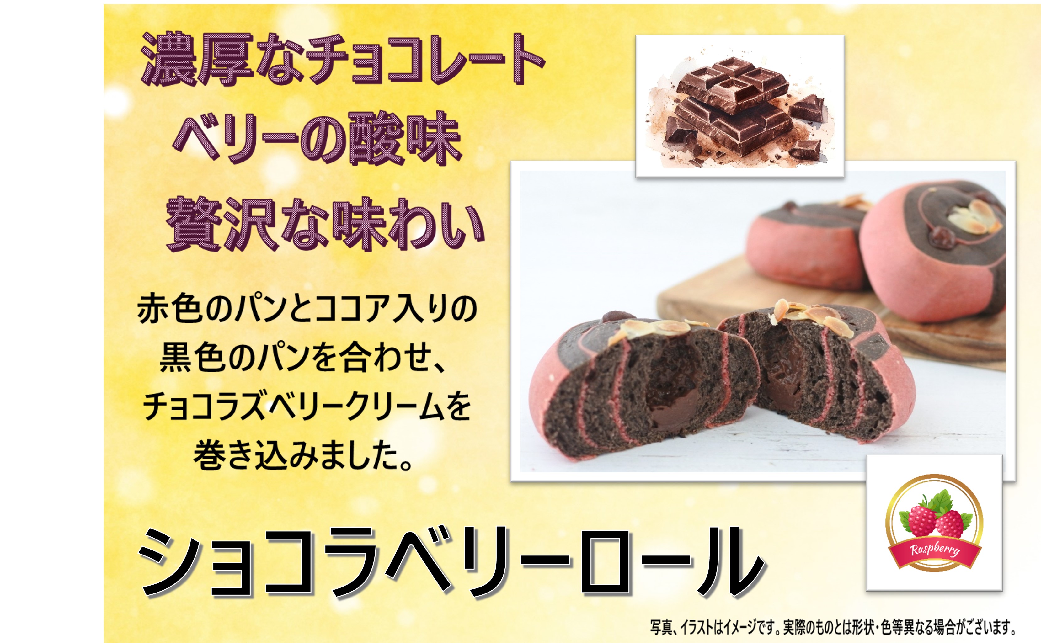 | 原材料名 | 小麦粉(国内製造)、チョコレートフラワーペースト、マーガリン、ラズベリージャム、砂糖、パン酵母、ココア、食塩/加工デンプン、トレハロース、グリシン、ソルビトール、着色料(紅麹、クチナシ赤色素、紅花黄、野菜色素)、ゲル化剤(増粘多糖類)、乳化剤、酸味料、香料、増粘多糖類、リン酸塩(Na、Ca)、ビタミンC、酵素、甘味料(スクラロース)、酸化防止剤(ビタミンE)、(一部に卵・小麦・乳成分・大豆・りんごを含む) |