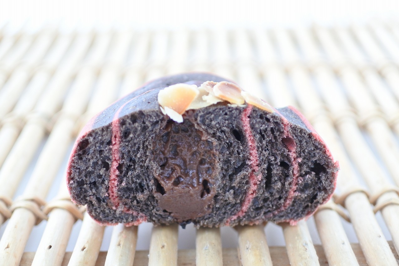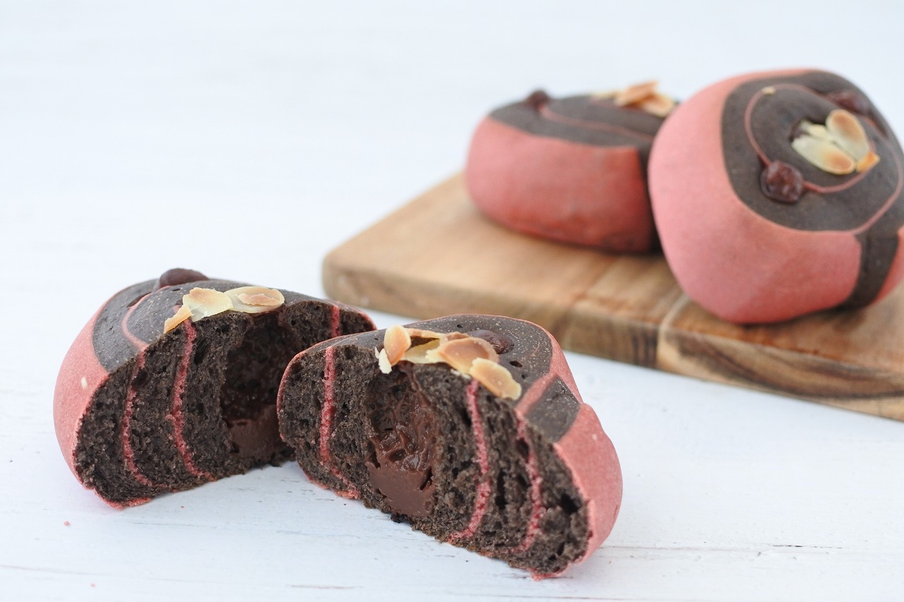 赤色の生地とココア入りの黒いパン生地を合わせ、チョコラズベリークリームを巻き込みました。
