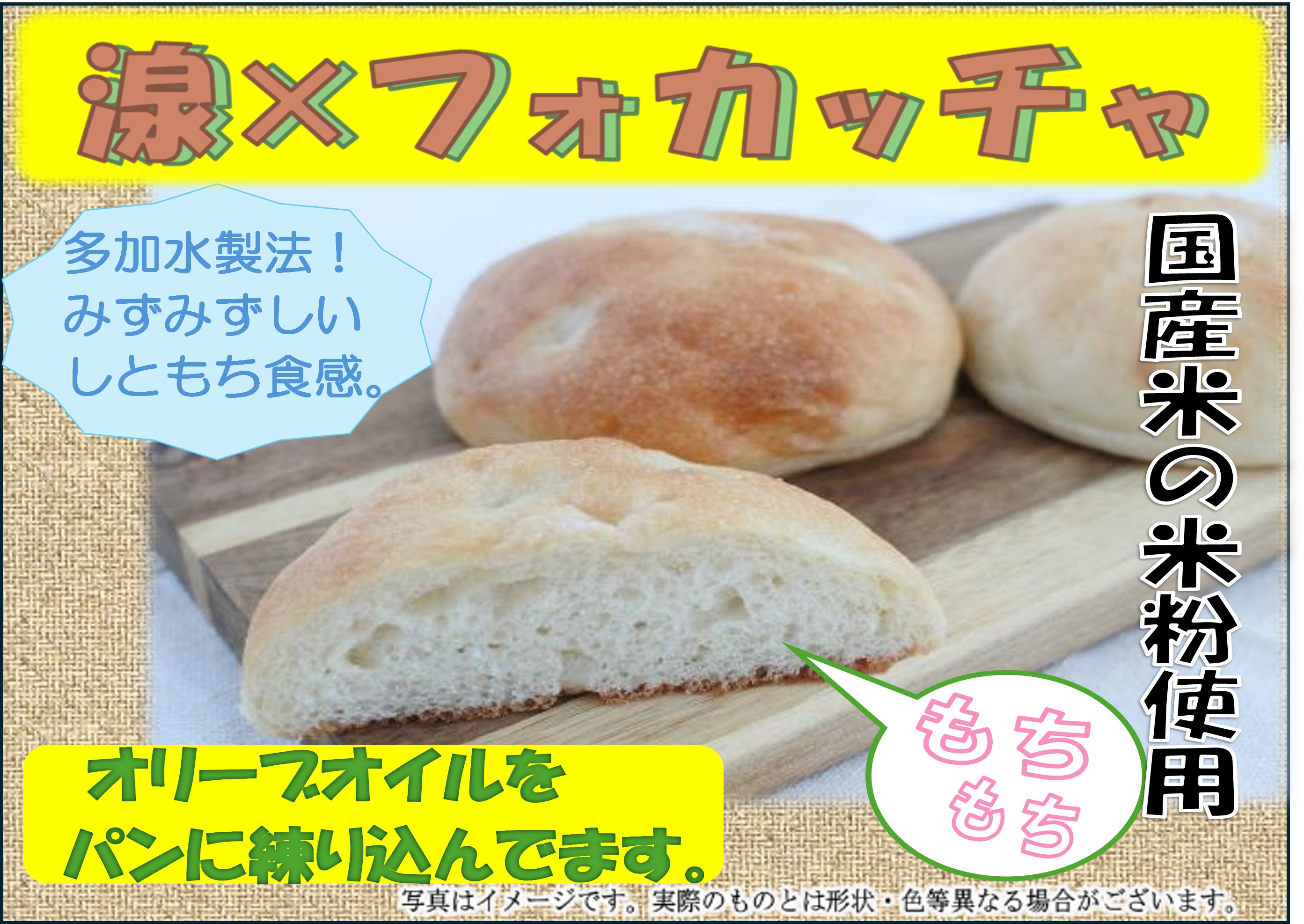 米粉とオリーブオイルを使用した、しっとりもっちり食感の多加水のフォカッチャ生地です。