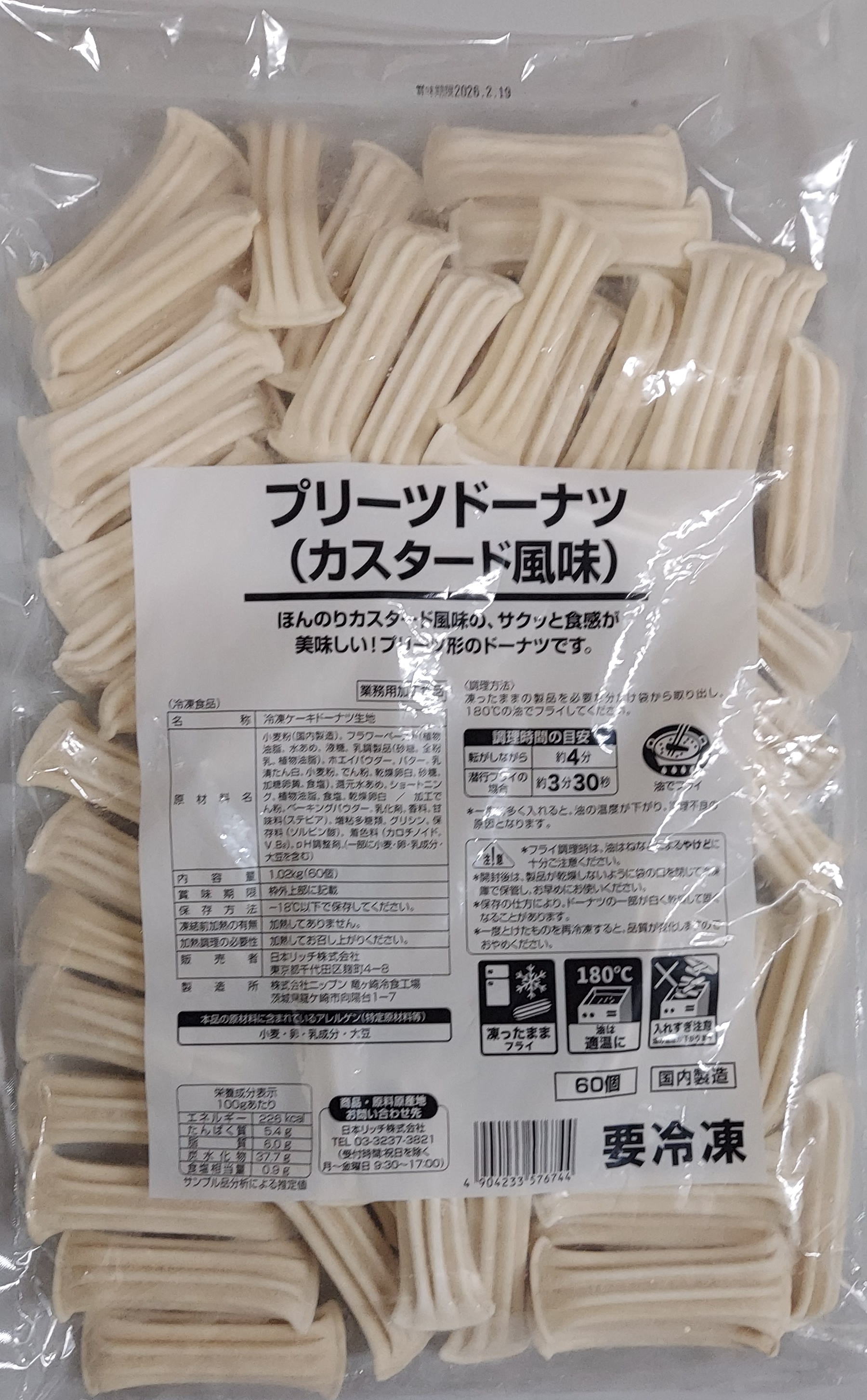 冷凍のまま揚げるだけで作ることができる、サクッと食感が後を引くフィリング入りのドーナツです。シンプルでおいしいカスタード風味が楽しめます。