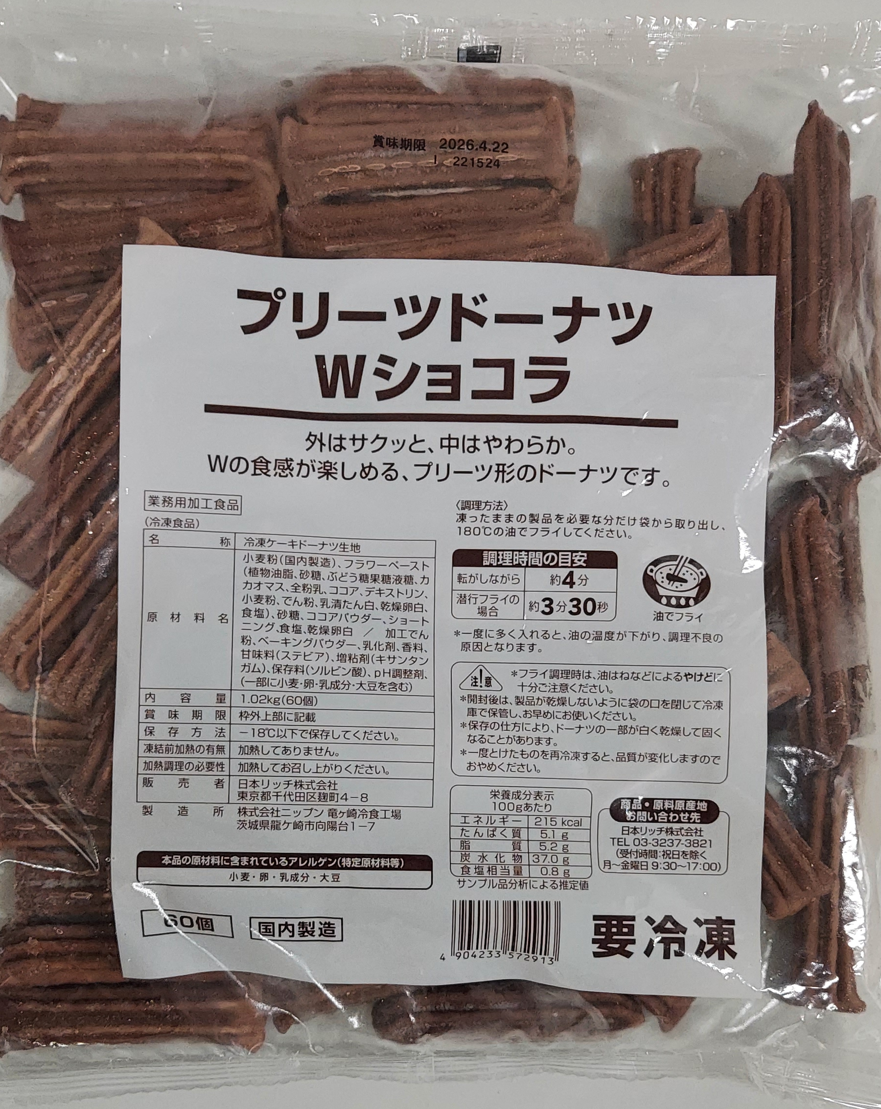 冷凍のまま揚げるだけで作ることができる、サクッと食感が後を引くフィリング入りのドーナツです。外生地とフィリング、ダブルでチョコレートの味わいを楽しめます。
