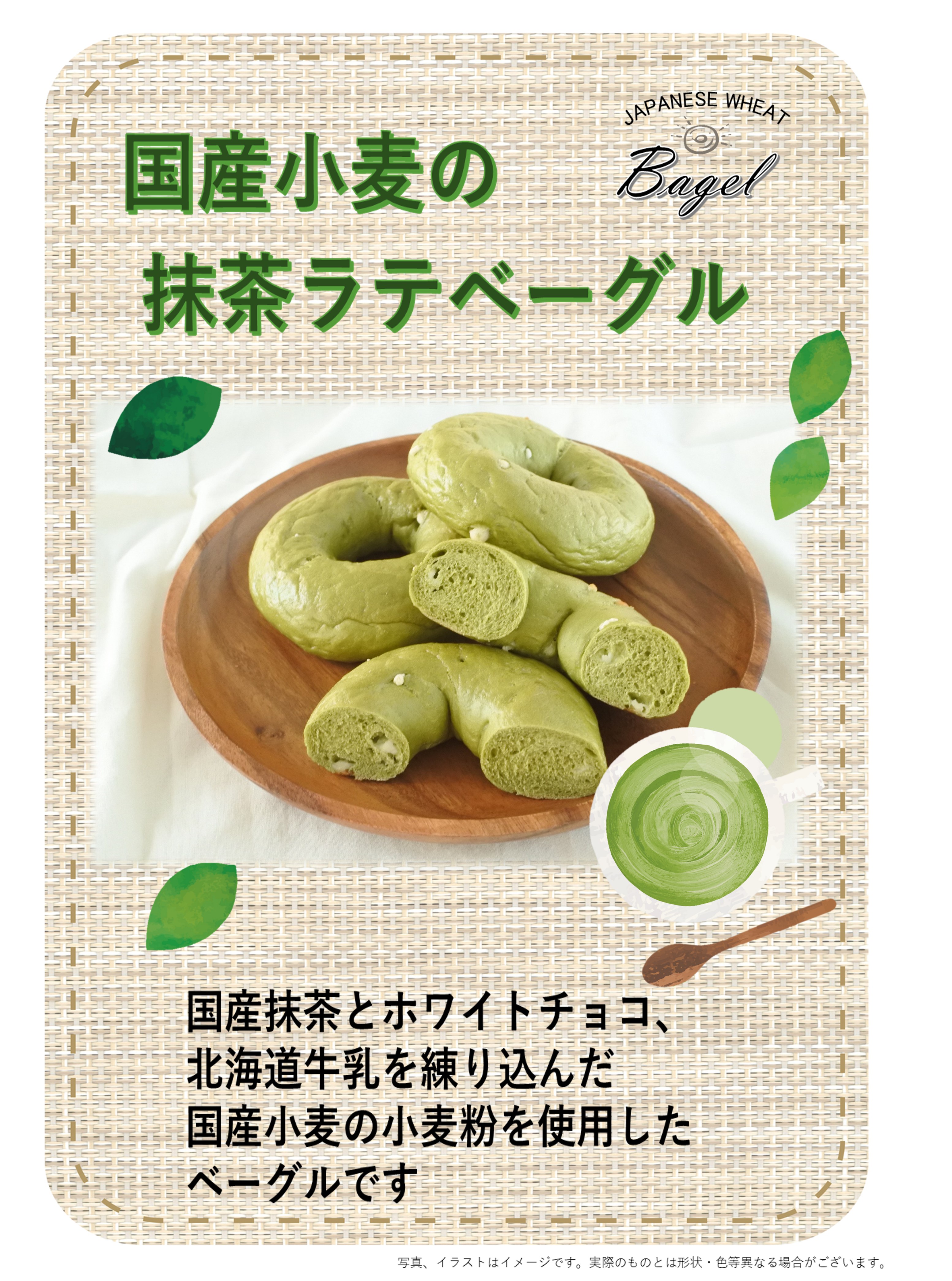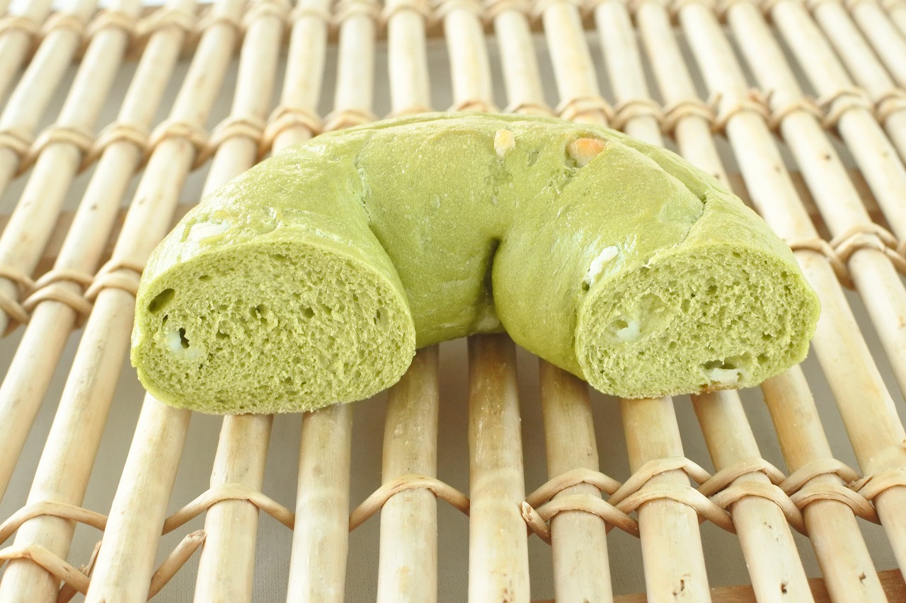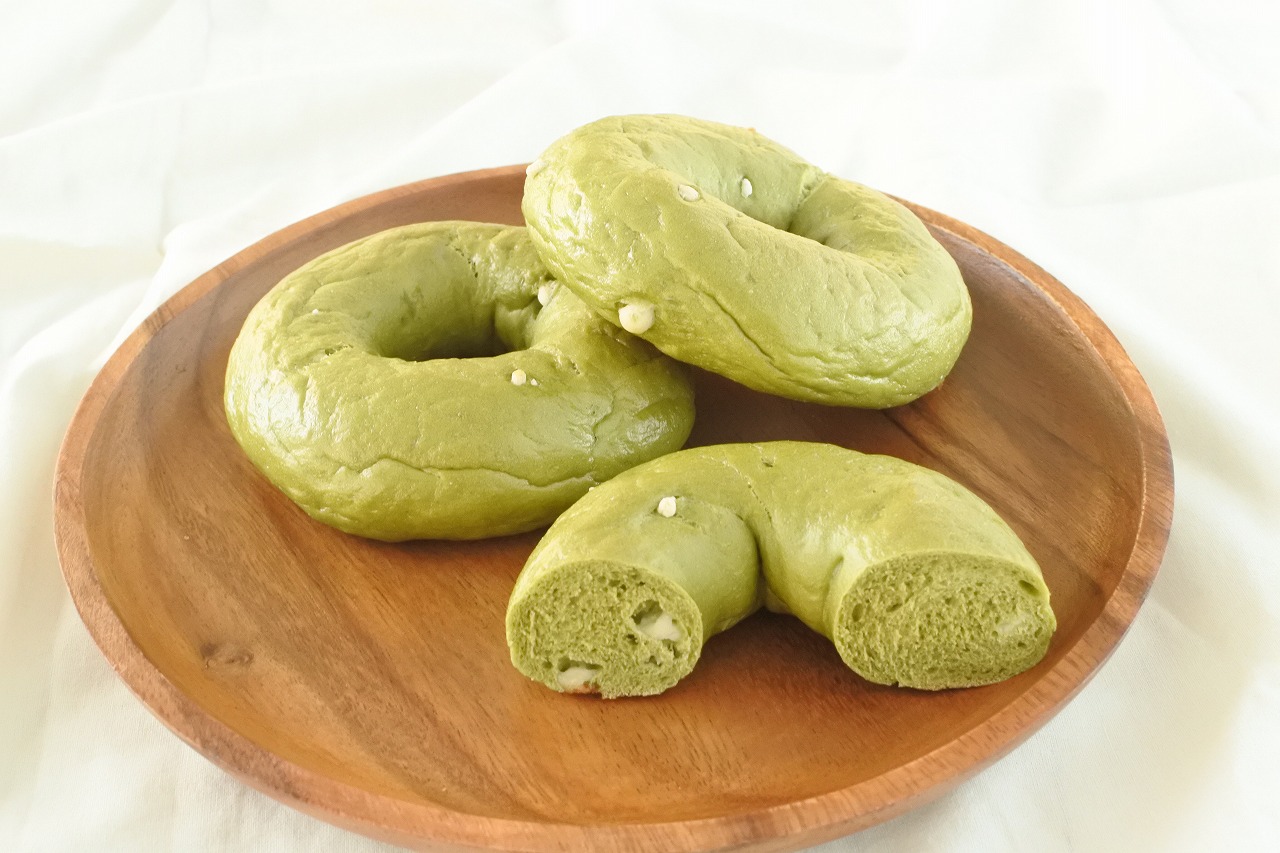 国産抹茶とホワイトチョコ、北海道牛乳を練り込んだ国産小麦の小麦粉を使用したベーグルです。