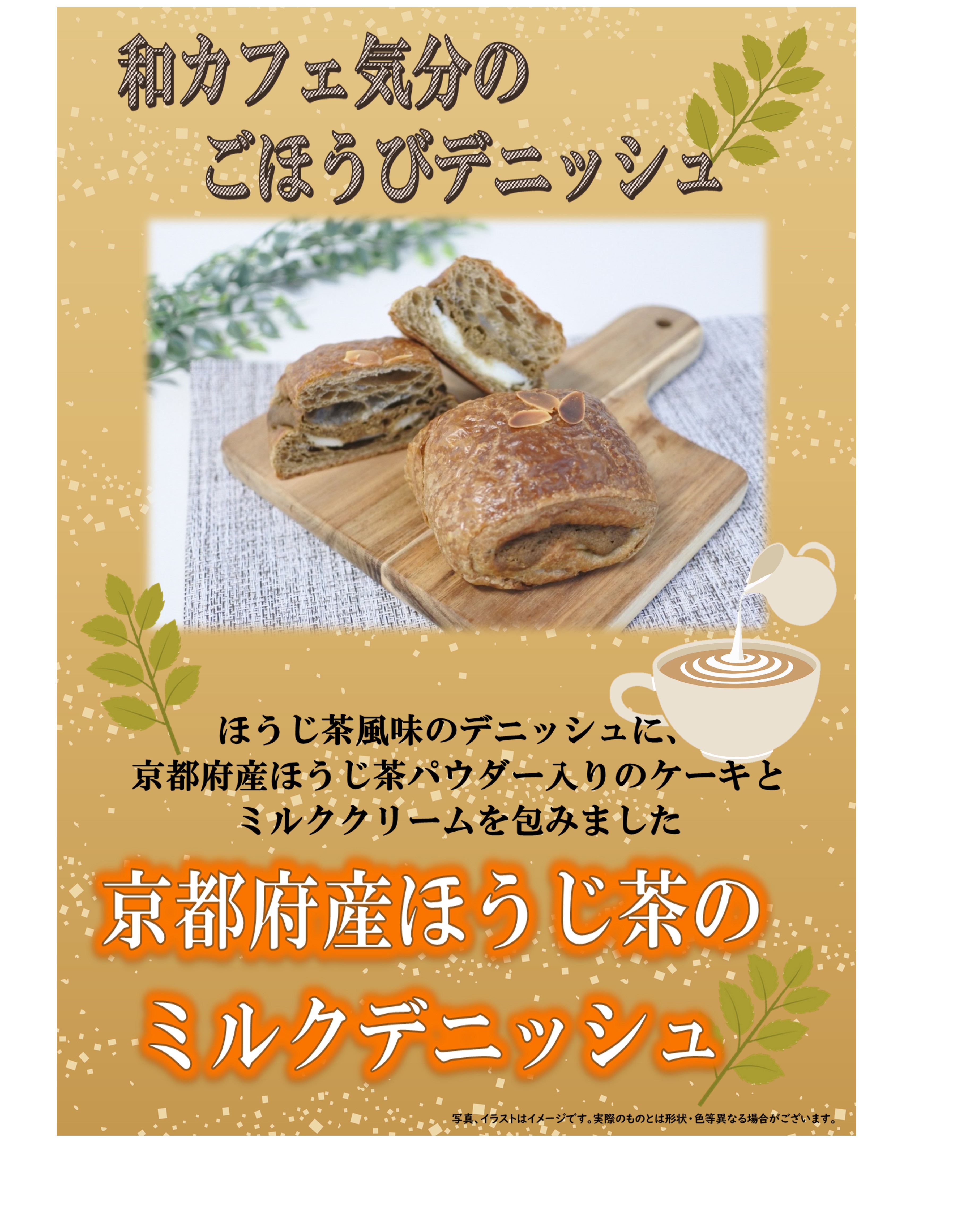 ほうじ茶風味のデニッシュ生地に、京都府産ほうじ茶パウダー入りのケーキ生地とミルククリームを包みました。