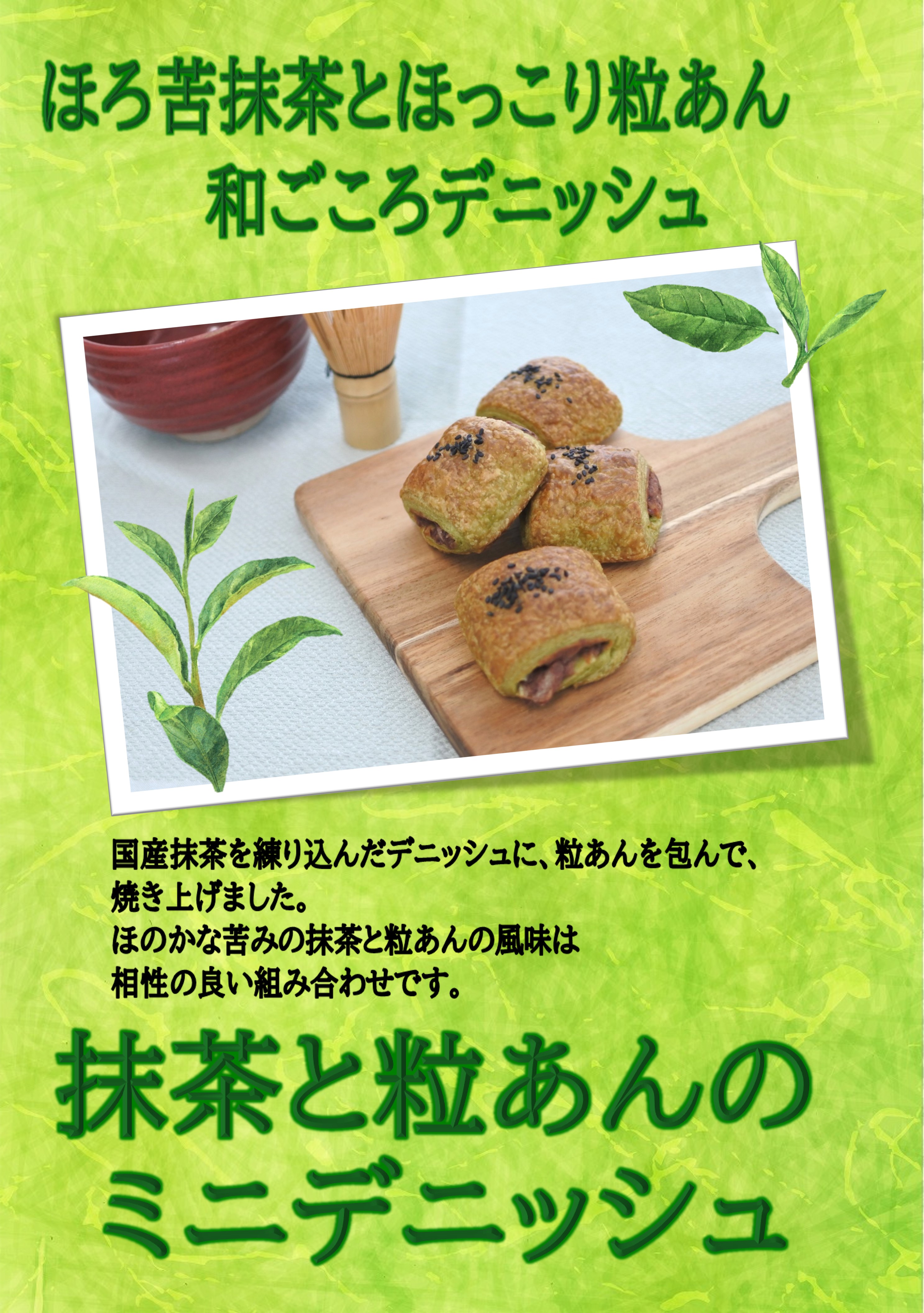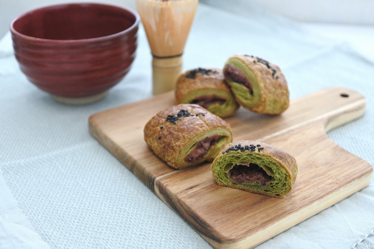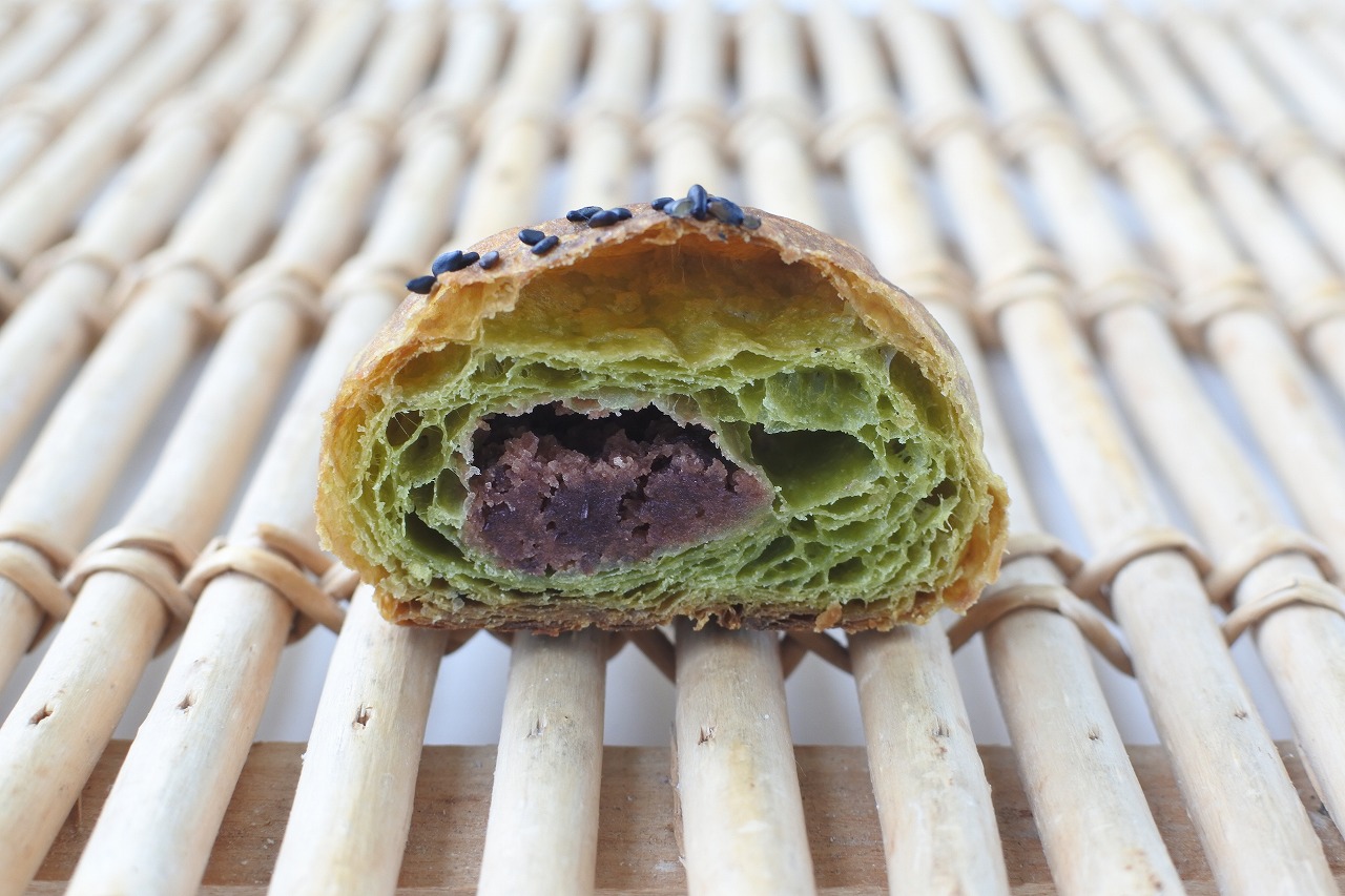 国産抹茶を練り込んだ生地で、粒あんを包みました。ノンホイロで焼成可能な商品です。