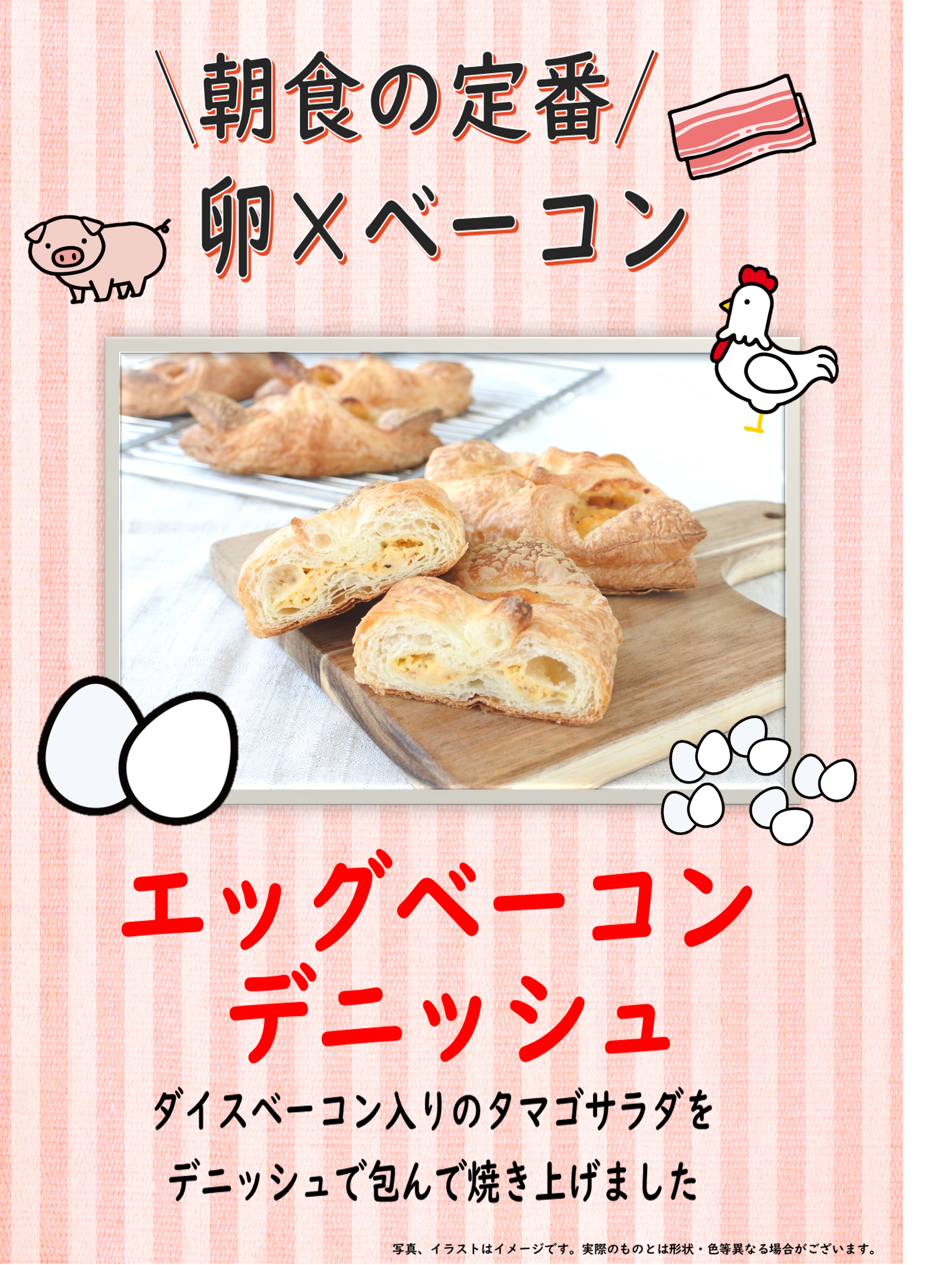ダイスベーコン入りのタマゴサラダをデニッシュ生地で包んだ、ホイロ不要の簡便商品です。