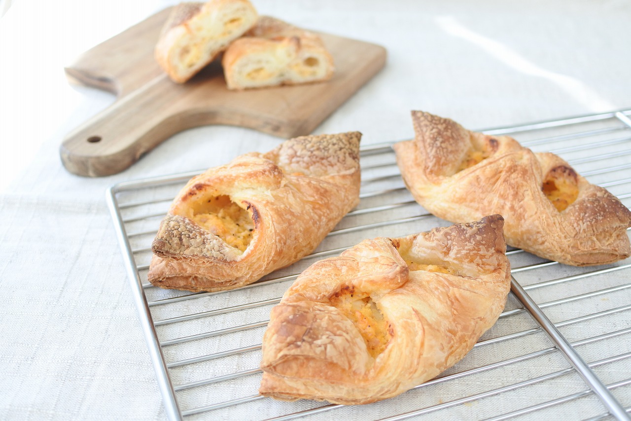ダイスベーコン入りのタマゴサラダをデニッシュ生地で包んだ、ホイロ不要の簡便製品です。