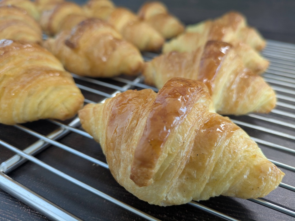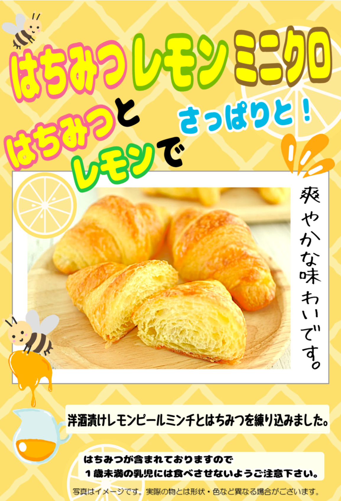 洋酒漬レモンピールミンチとはちみつを練り込んだミニクロワッサンです。夏にぴったり、且つ万人受けするさっぱりとした味わいです。