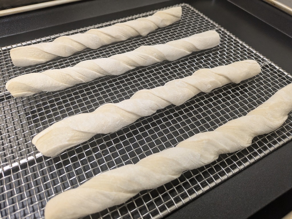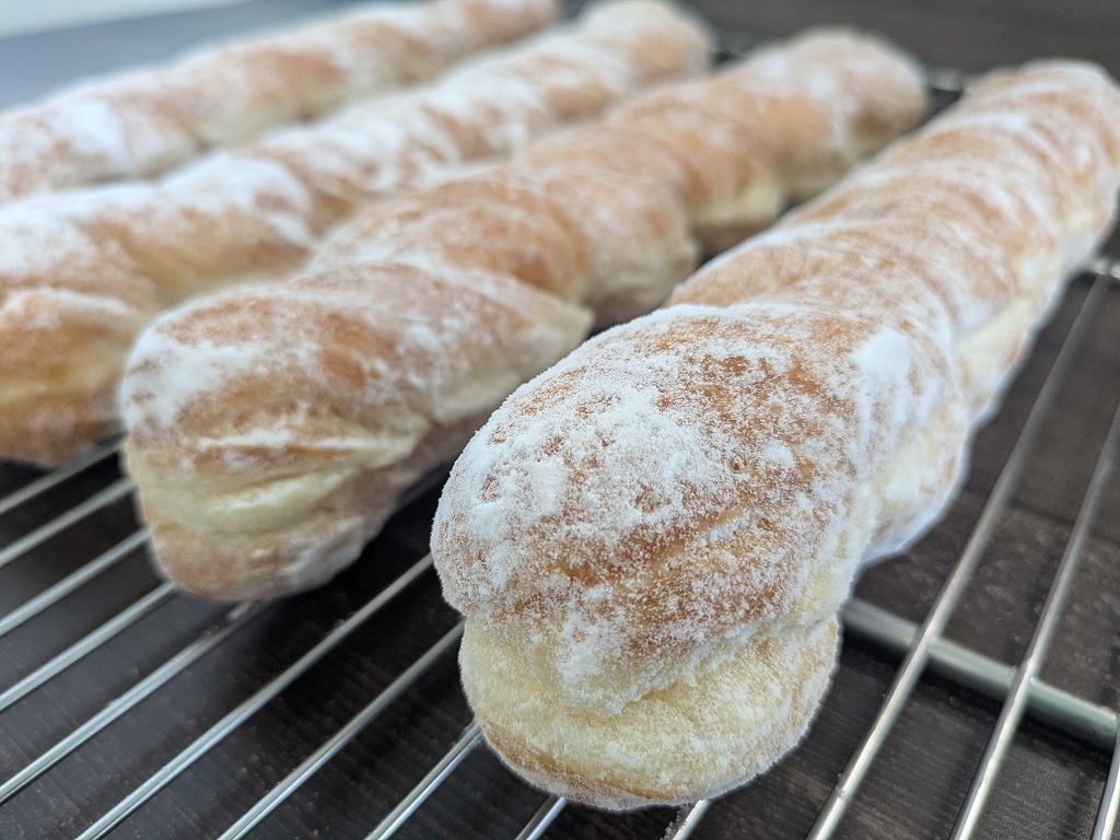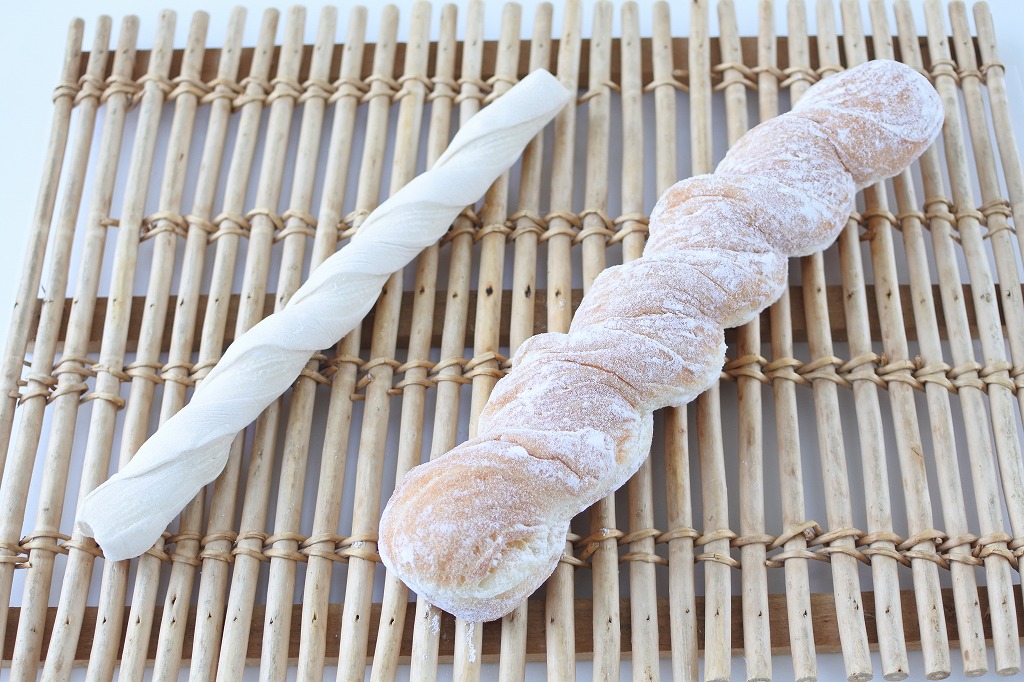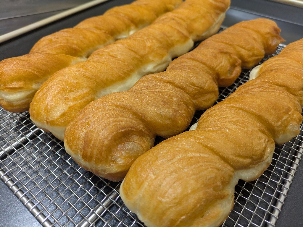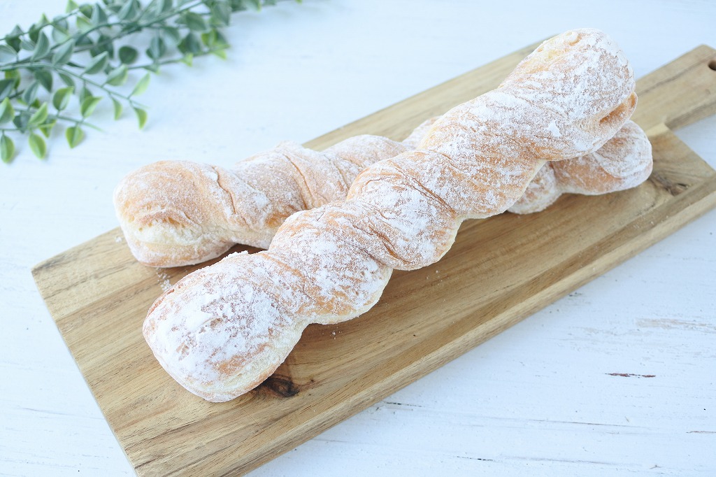 発酵種と国産小麦の小麦粉を使用した生地に、油脂入りの生地を折り込んだツイスト整形済みのドーナツです。