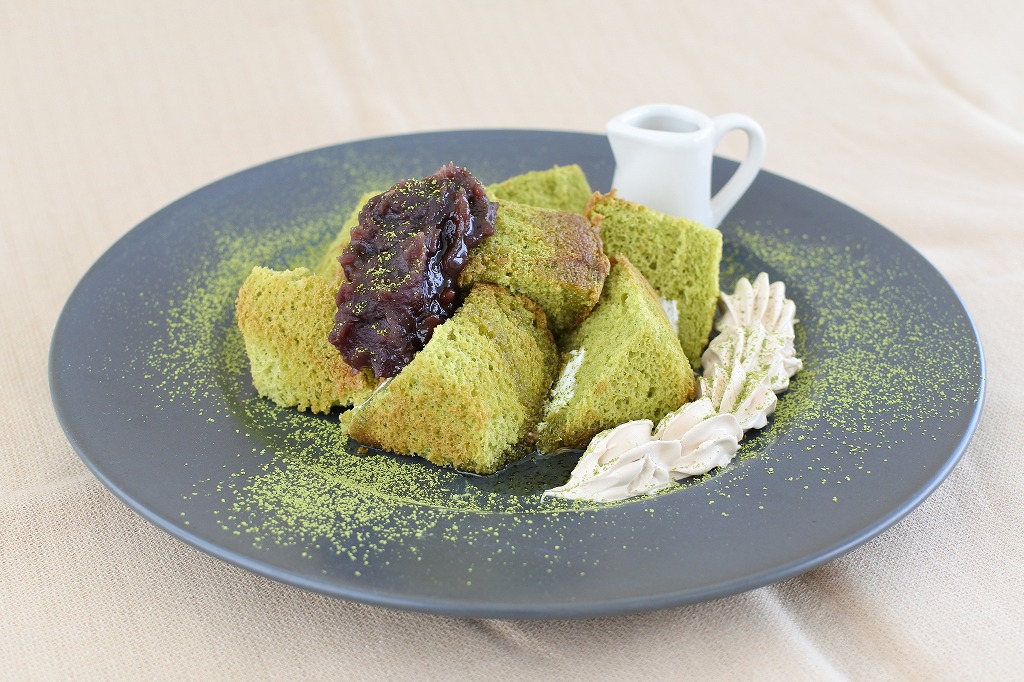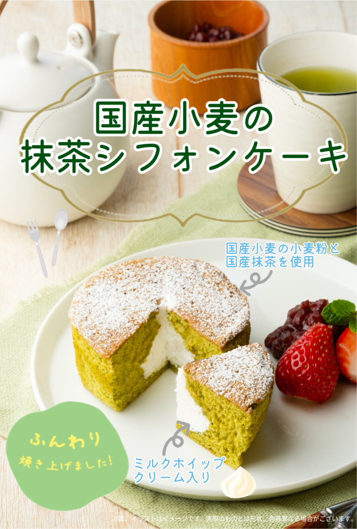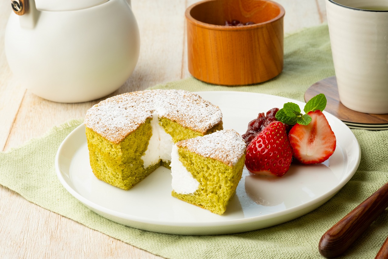 国産小麦の小麦粉と国産抹茶を使用し、ふんわり焼き上げたシフォンケーキです。ミルクホイップクリームを入れました。