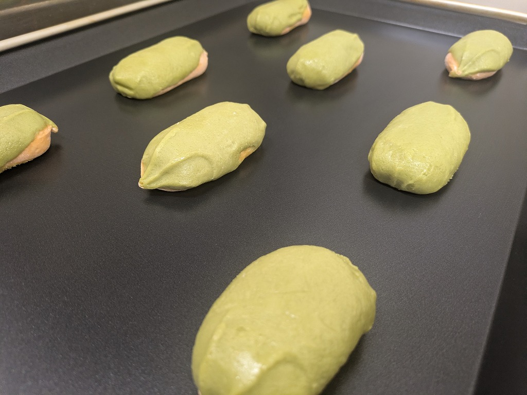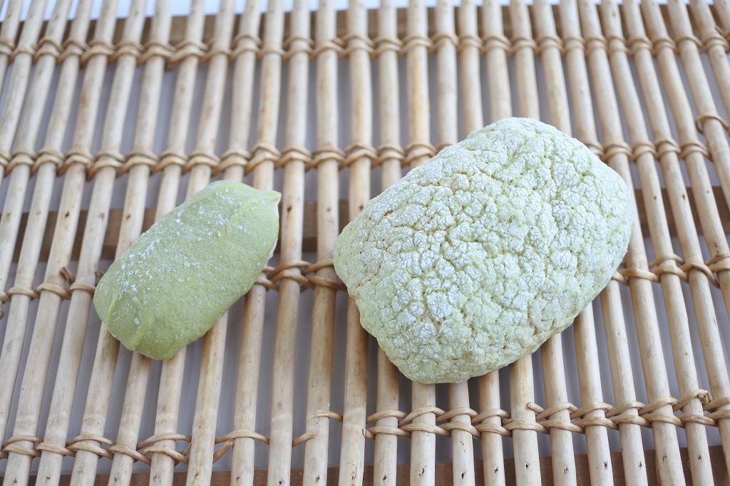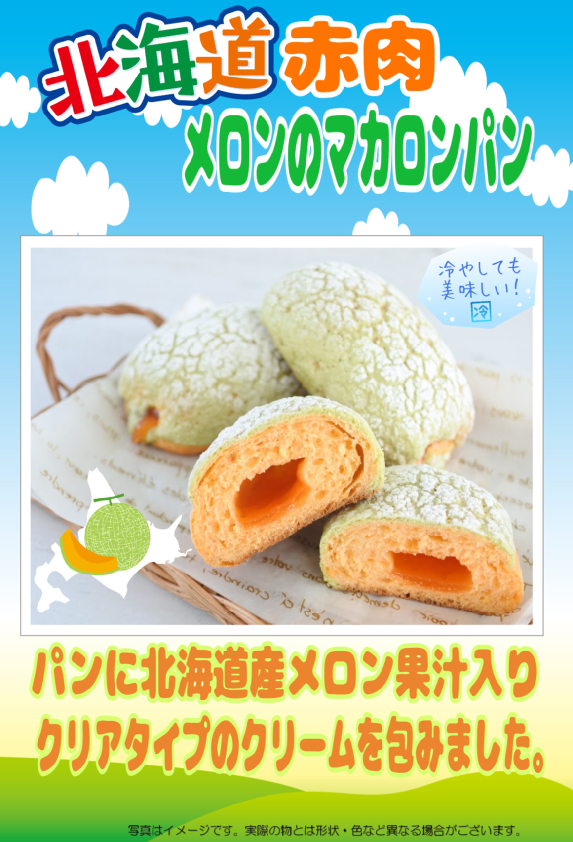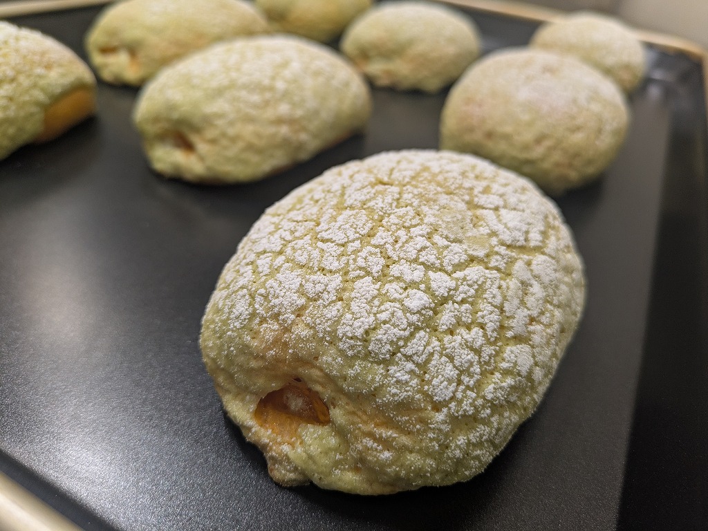 オレンジ色のパン生地で北海道メロンの果汁入りのクリアタイプのクリームを包み、緑色のマカロン風のビスケット生地を被せた商品です。